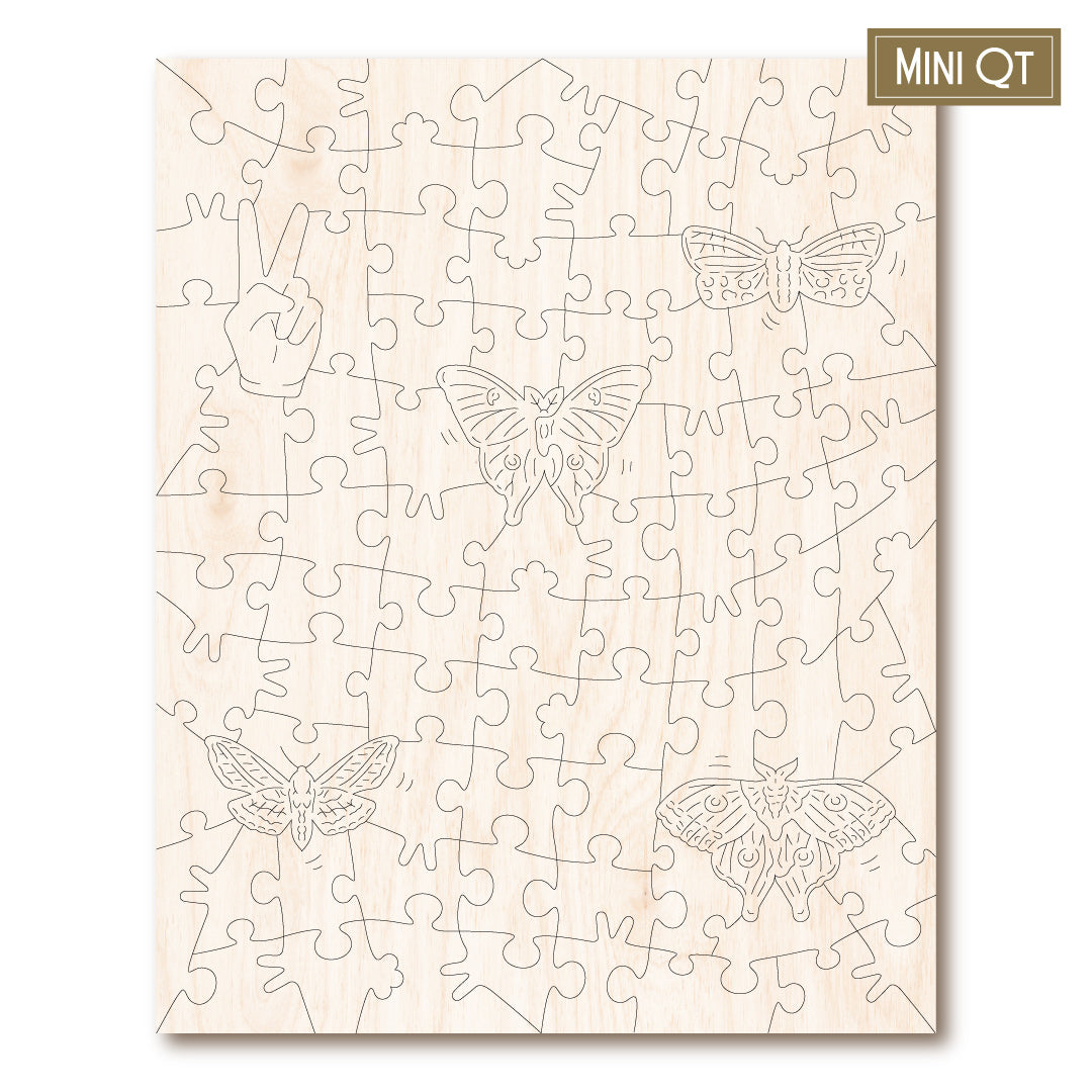 Our MINI QT puzzles are laser cut from thick, 4mm plywood and include 5 whimsies - they make a great puzzle snack!