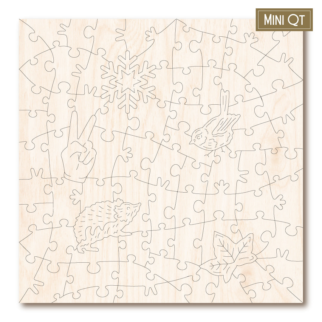 Our MINI QT puzzles are laser cut from thick, 4mm plywood and include 5 whimsies - they make a great puzzle snack!