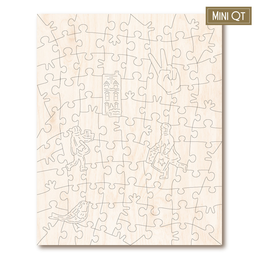 Our MINI QT puzzles are laser cut from thick, 4mm plywood and include 5 whimsies - they make a great puzzle snack!