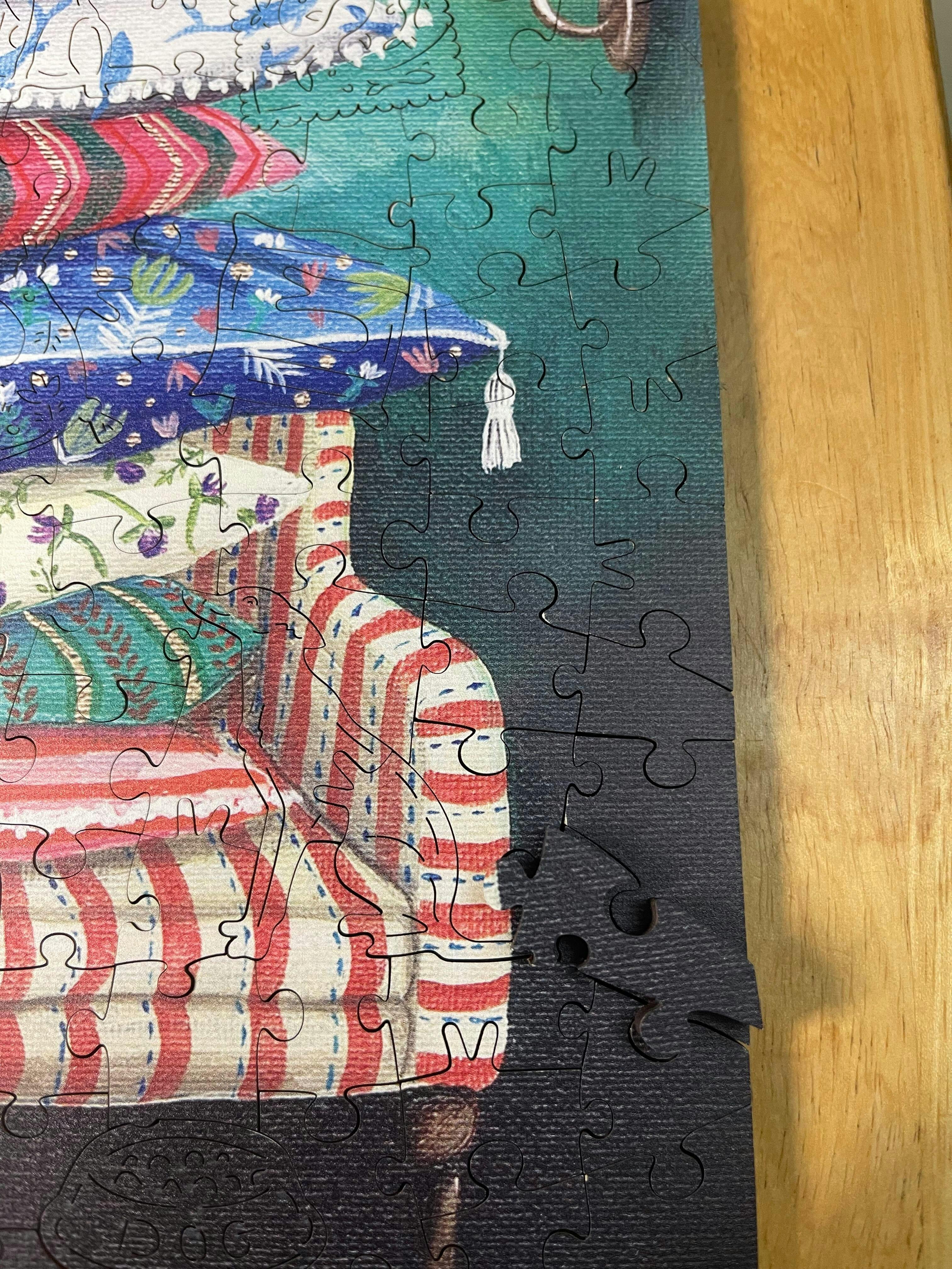 First time purchasing a puzzle from this company and I thought they would be at the same quality as another company I use, however I was disappointed. There was an extra piece in my box, one piece was badly chipped and some of the other pieces were slightly missing colour (although minimal). Some pieces were fiddly to connect as they didn’t fit that snugly. However I think the design is cute and I enjoyed finding and fitting the whimsicals.
