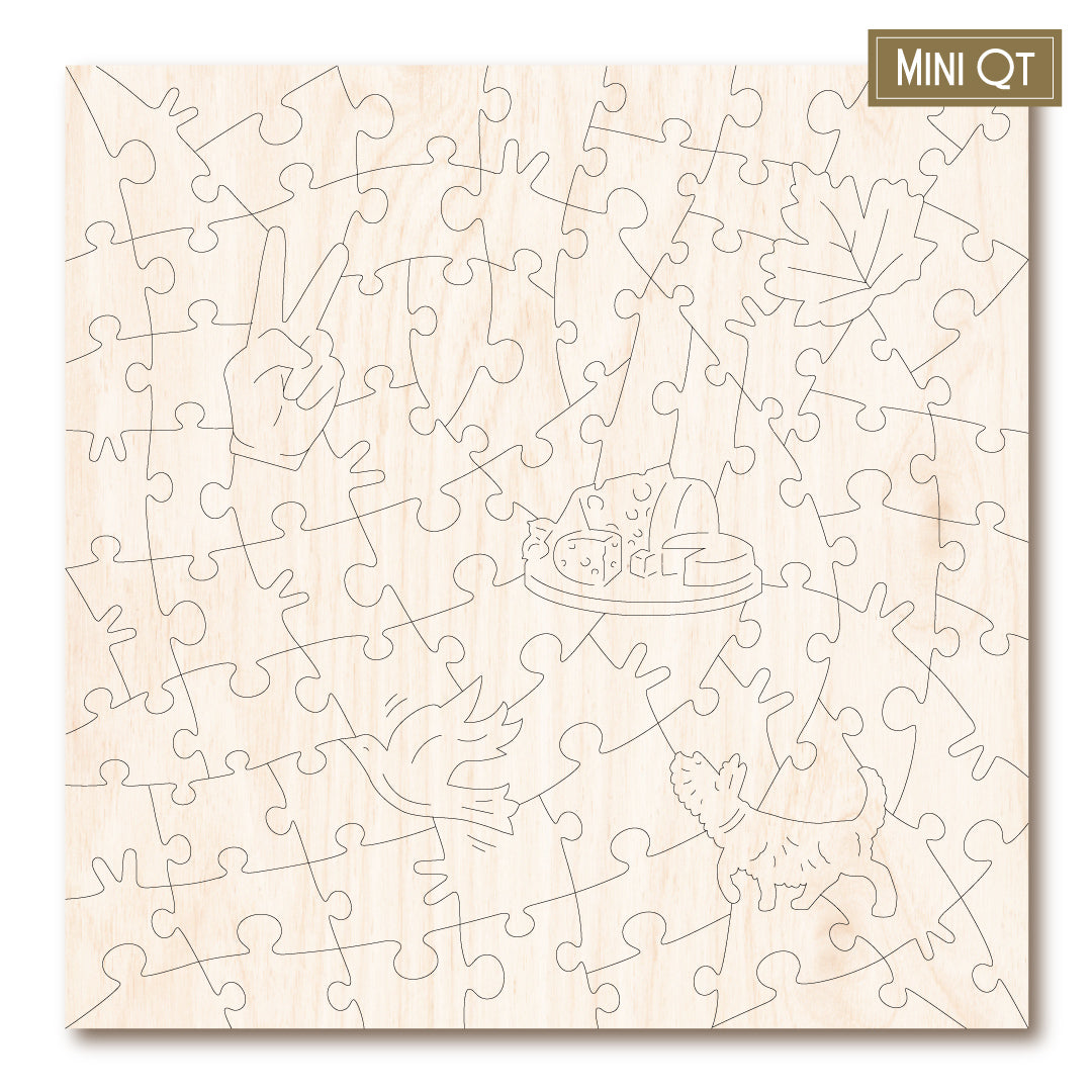 Our MINI QT puzzles are laser cut from thick, 4mm plywood and include 5 whimsies - they make a great puzzle snack!