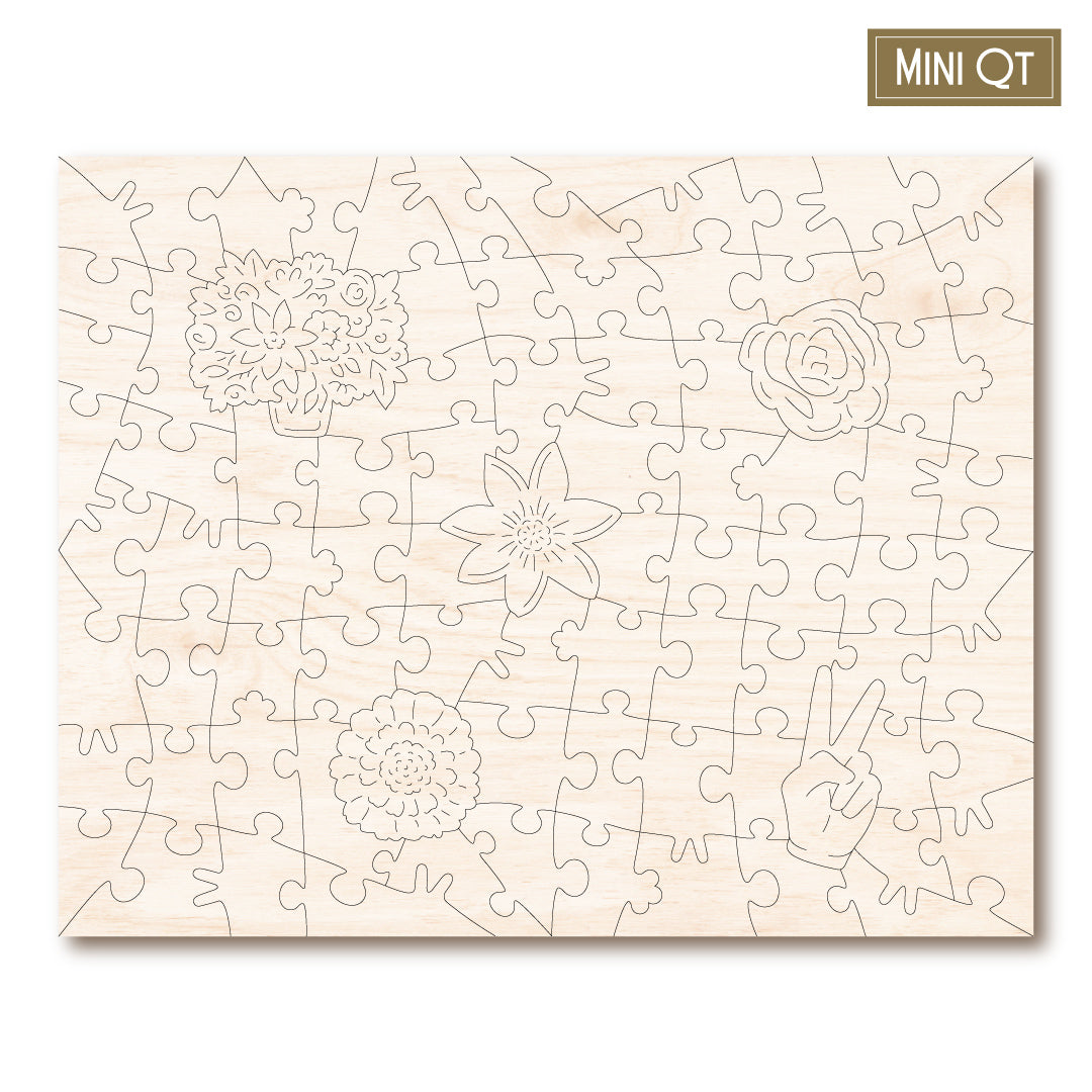 Our MINI QT puzzles are laser cut from thick, 4mm plywood and include 5 whimsies - they make a great puzzle snack!