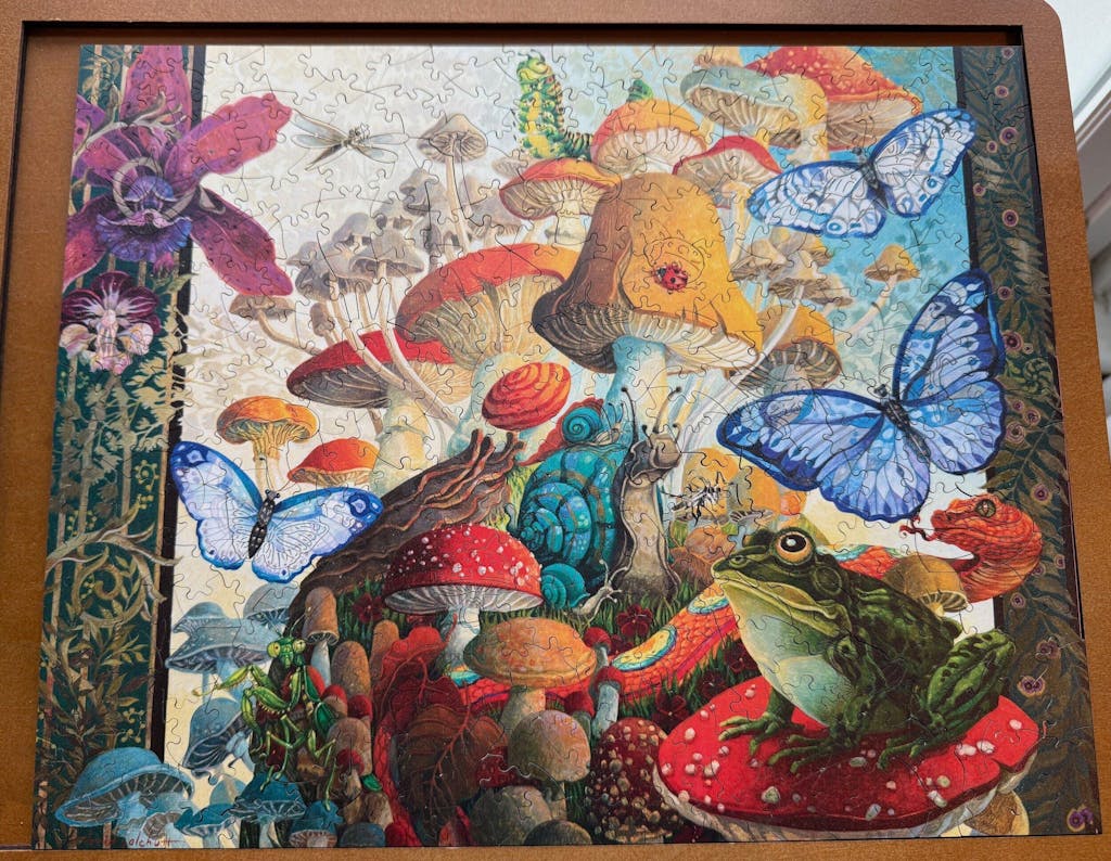 Opening the box felt a little magical. The first thing I saw was a cluster of whimsy mushrooms sitting right on top. As a new puzzler, this one was challenging for me. I started with the edges, then the butterflies and the frog before filling in the rest.